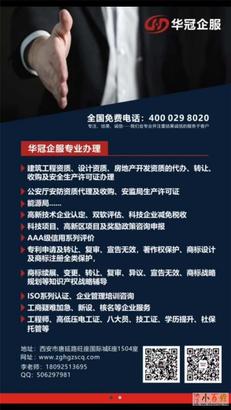 西安华冠企服是一家致力于为企业服务的公司,是知识产权优质的企业服务机构之一小百姓网。公司本着“专注,结果诚信”的服务 理念致力于广大客户提供:AAA级企业认证,公安厅安全防范资质安防资质www.xbaixing.com小百姓网。建筑施工工程资质,安全生产许可证,双软认证,著作权保护,专利申请、商标注册x b a i x i n g c o m。高新技术企业认定x_b_a_i_x_i_n_g_c_o_m。ISO系列认证小~百~姓~网。安监局生产许可证等受到广大客户的一致好评!