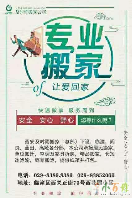 西安及时雨搬家(总部)下设,临潼,阎良,蓝田,高陵各分部,本公司承接居民搬家,单位搬迁,空调及家具拆装,精品搬家,长短途运输,钢琴搬运,提供纸箱并打包。x+b+a+i+x+i+n+g+c+o+m